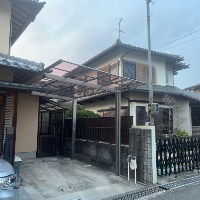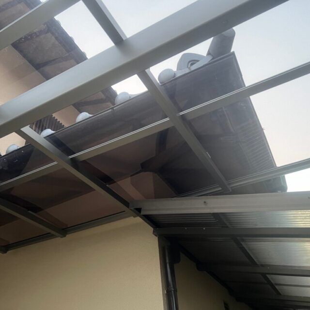 駐車スペースには1階屋根がのびてきており、奥には波板の路地のテラス屋根も飛び出していて、その間に新しい駐車場屋根を差し込むという、かなり厳しい条件でのガレージ屋根の工事でした。